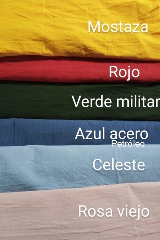 Colores con los que trabajamos: blanco, natural, arena, tostado, canela, mostaza, verde seco, verde militar, verde palta, azul petróleo, azul marino, celeste, bordo, carmín, rojo, rosa viejo, naranja, gris perla, gris acero y negro.