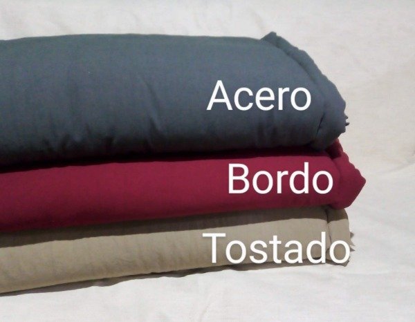 Colores con los que trabajamos: blanco, natural, arena, tostado, canela, mostaza, verde seco, verde militar, verde palta, azul petróleo, azul marino, celeste, bordo, carmín, rojo, rosa viejo, naranja, gris perla, gris acero y negro.